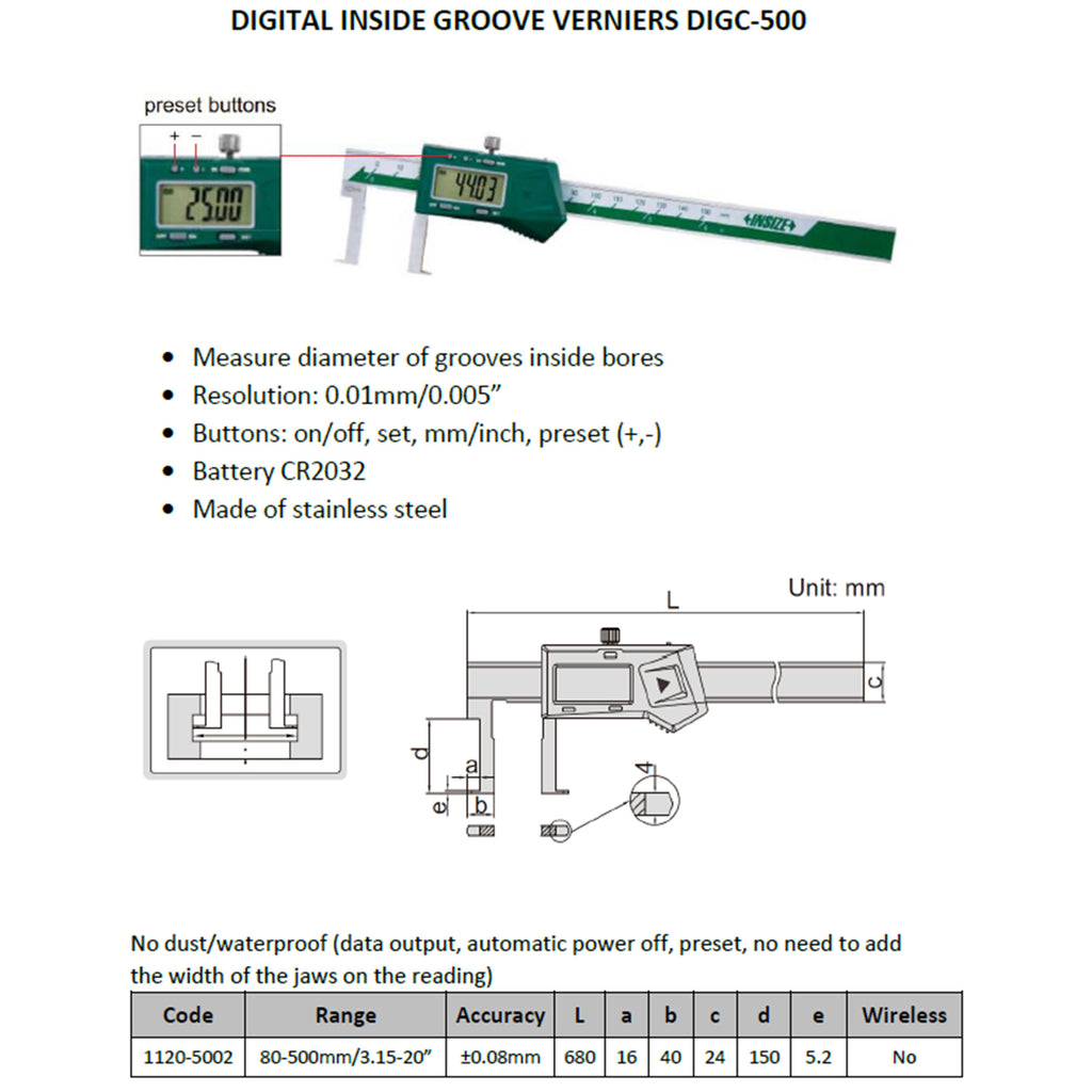 Measure diameter of grooves inside bores. Resolution: 0.01mm/0.005”. Buttons: on/off, set, mm/inch, preset (+,-). Battery CR2032. Made of stainless steel.